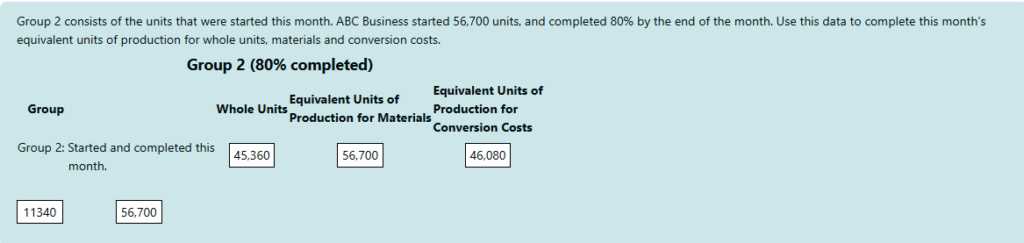4. Group 2 consists of the units that were started this month. ABC Business started 56,700 units, and completed 80% by the end of the month. Use this data to complete this month’s equivalent units of production for whole units, materials and conversion costs.