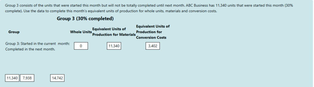6. Group 3 consists of the units that were started this month but will not be totally completed until next month. ABC Business has 11,340 units that were started this month (30% complete). Use the data to complete this month’s equivalent units of production for whole units, materials and conversion costs.
