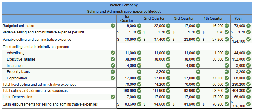 The company’s variable selling and administrative expense per unit is $1.70. Fixed selling and administrative expenses include advertising expenses of $11,000 per quarter, executive salaries of $38,000 per quarter, and depreciation of $17,000 per quarter. In addition, the company will make insurance payments of $4,000 in the first quarter and $4,000 in the third quarter. Finally, property taxes of $8,200 will be paid in the second quarter.