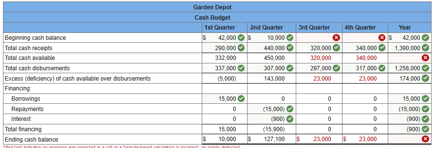 The company’s beginning cash balance for next year will be $42,000. The company requires a minimum cash balance of $10,000 and may borrow money at the beginning of any quarter and may repay any part of its loans at the end of any quarter. Interest payments, based on a quarterly interest rate of 3%, are due on any principal at the time it is repaid. For simplicity, assume interest is not compounded.