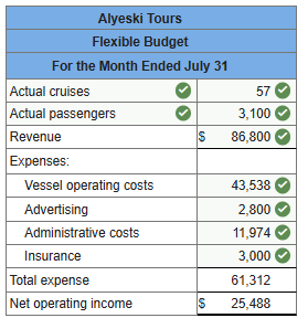 For example, vessel operating costs should be $6,600 per month plus $474.00 per cruise plus $3.20 per passenger. The company’s sales should average $28.00 per passenger. In July, the company provided 57 cruises for a total of 3,100 passengers.