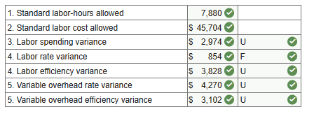 Note: For requirements 3 through 5, indicate the effect of each variance by selecting “F” for favorable, “U” for unfavorable, and “None” for no effect (i.e., zero variance). Input all amounts as positive values. Do not round intermediate calculations.