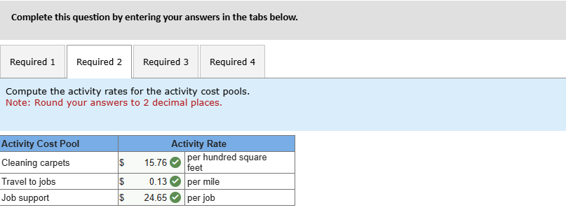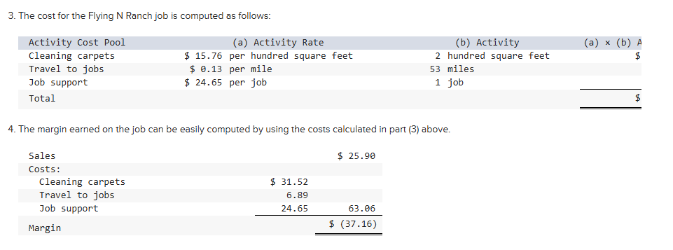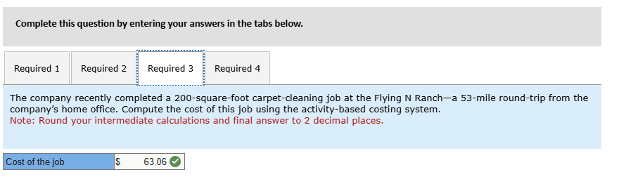 The company recently completed a 200-square-foot carpet-cleaning job at the Flying N Ranch—a 53-mile round-trip from the company’s home office. Compute the cost of this job using the activity-based costing system.