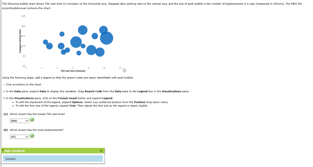1. The following bubble chart shows TSA wait time (in minutes) on the horizontal axis, cheapest daily parking rate on the vertical axis, and the size of each bubble is the number of enplanements in a year (measured in millions). The PBIX file airportbubblevisual contains this chart.