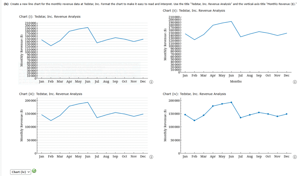 Create a new line chart for the monthly revenue data at Tedstar, Inc. Format the chart to make it easy to read and interpret. Use the title “Tedstar, Inc. Revenue Analysis” and the vertical-axis title “Monthly Revenue ($).”