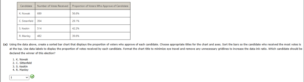 5.Approval voting is a type of voting system in which voters can vote for any number of eligible candidates. A vote for a candidate in this type of system indicates that the voter “approves” of that candidate for the position the candidate is seeking. In the final tally of the election results, the total number of approval votes for each candidate is calculated. The candidate who receives the most approval votes is declared the winner. The figure below displays the results from an approval voting election in which there were four eligible candidates: S. Keskin, R. Manley, K. Nowak, and C. Sittenfeld. A total of 1218 voters participated in this election. The table below shows the number of votes received by each candidate as well as the proportion of voters who approved of each candidate.