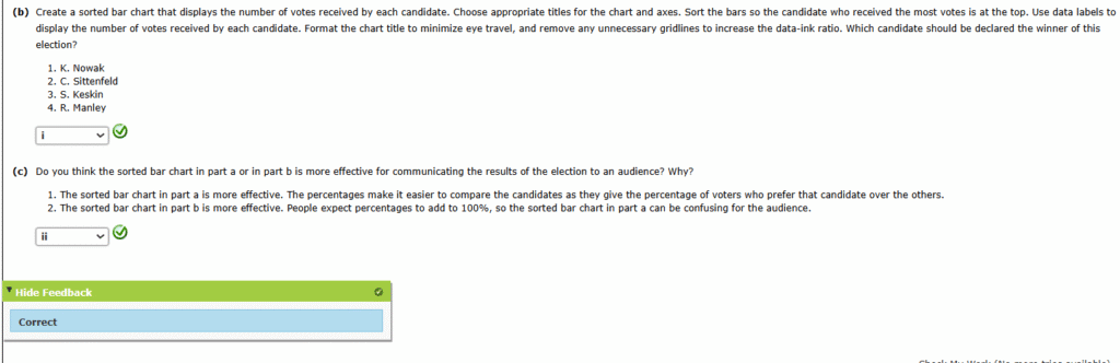 - The sorted bar chart in part a is more effective. The percentages make it easier to compare the candidates as they give the percentage of voters who prefer that candidate over the others.