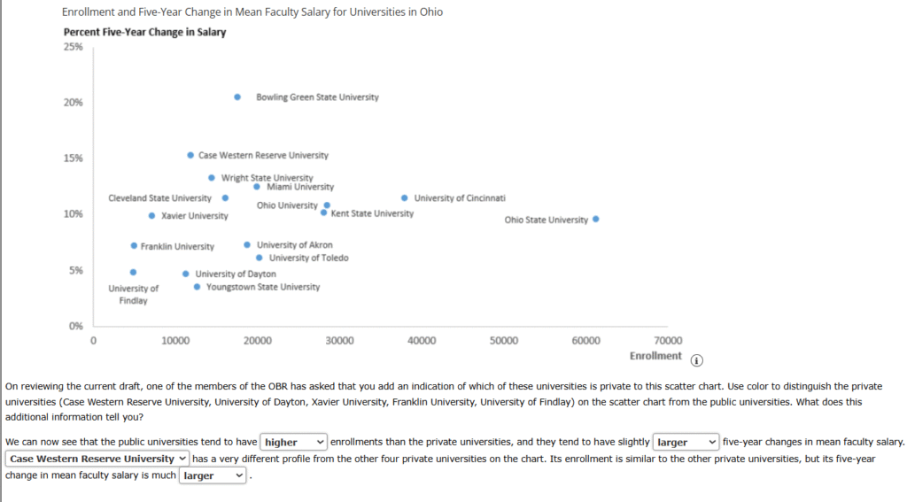 2. The Ohio Board of Regents (OBR) is preparing its five-year report on the state of higher education in Ohio. The current draft of the report includes a scatter chart of enrollment and the percentage five-year change in average faculty salary for the 16 largest four-year institutions in the state. The scatter chart that is included in the current draft of the report follows and is provided in the file ohhigheredchart.