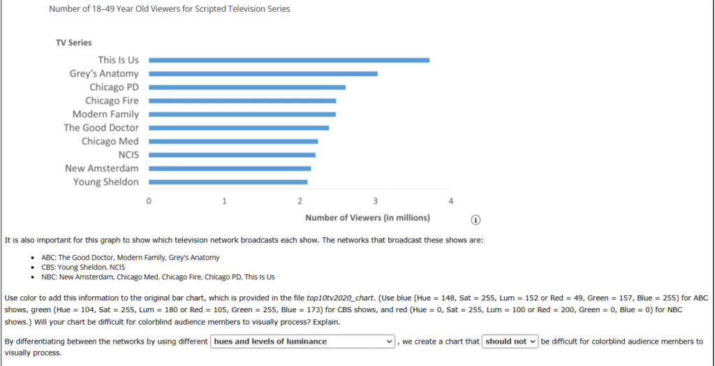5. The 18–49 age group is an extremely lucrative demographic for television networks. Advertisers pay a premium to reach consumers in this age group with their advertising. The following bar chart shows the number of viewers in millions that the top 10 scripted series averaged during the 2019–2020 television season.