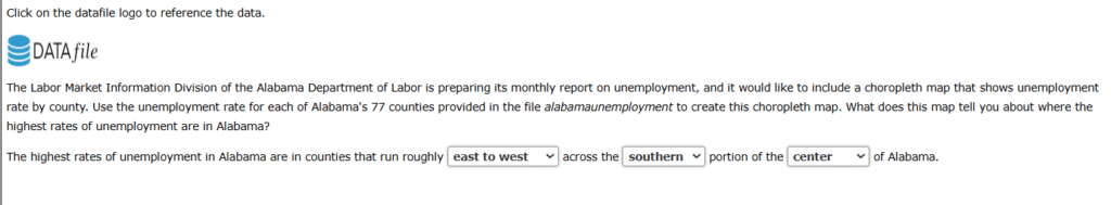 6. The Labor Market Information Division of the Alabama Department of Labor is preparing its monthly report on unemployment, and it would like to include a choropleth map that shows unemployment rate by county. Use the unemployment rate for each of Alabama’s 77 counties provided in the file alabamaunemployment to create this choropleth map. What does this map tell you about where the highest rates of unemployment are in Alabama?