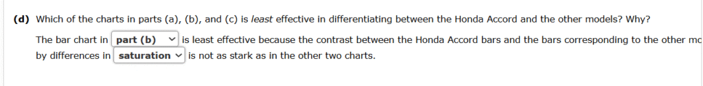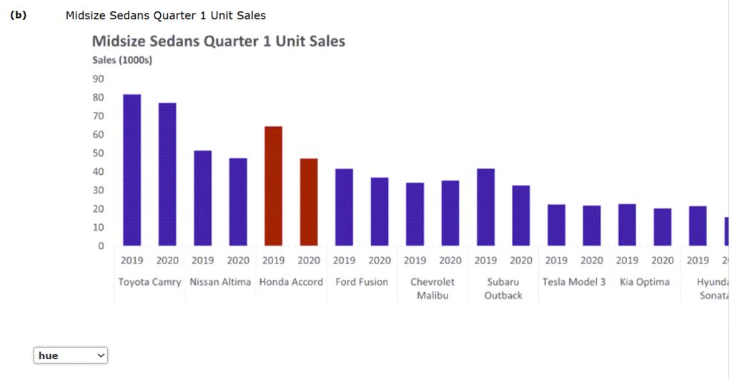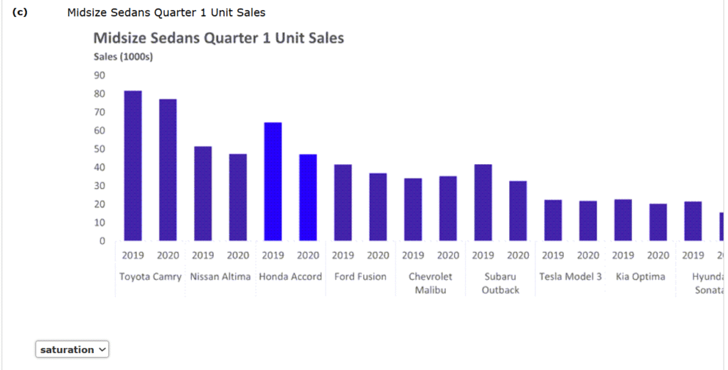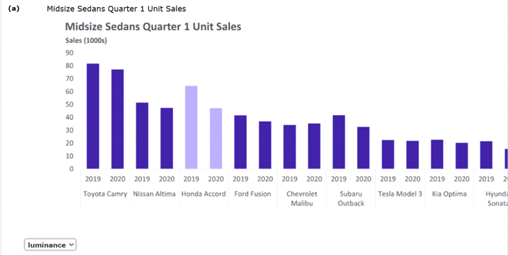 1.The charts in parts (a), (b), and (c) each show 2019 and 2020 quarter 1 sales for nine popular midsize sedans. These charts are included in worksheets of the same names (ab, and c) in the file q1saleschart. Determine whether hue, saturation, or luminance is used to differentiate the Honda Accord from the other eight models in each chart.