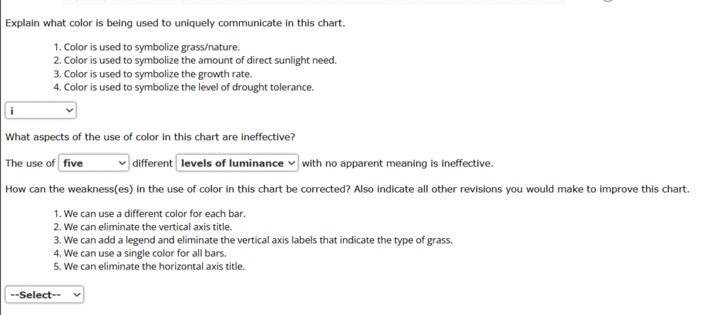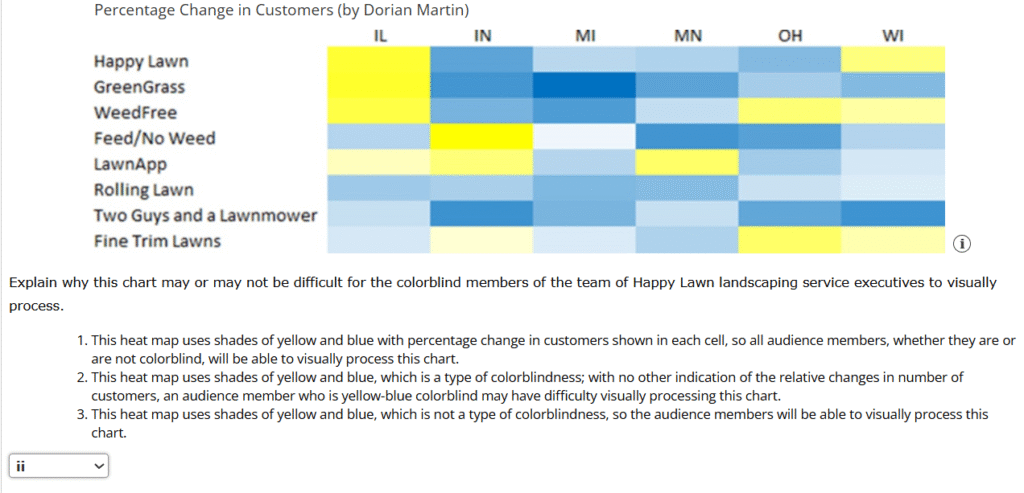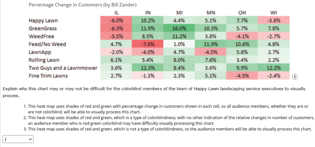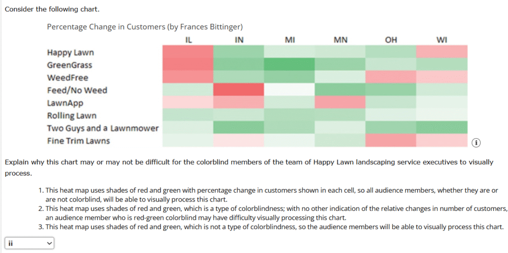 2. Four design artists (Frances Bittinger, Dorian Martin, Bill Zander, and Mariana Knoop) of a regional marketing research firm’s graphic arts department have each designed a chart for use in a presentation to a team of Happy Lawn landscaping service executives, two of whom are colorblind. Each has designed a heat map showing the relative percentage change in the number of customers using various lawn care services over the past year in several Midwestern states: Illinois (IL), Indiana (IN), Michigan (MI), Minnesota (MN), Ohio (OH), and Wisconsin (WI).