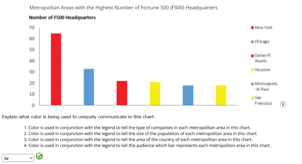 6. According to USA Today, the headquarters of over one-third of all Fortune 500 (F500) companies are located in one of six U.S. metropolitan areas: Chicago, Dallas-Ft. Worth, Houston, Minneapolis-St. Paul, New York, and San Francisco. The following chart displays the number of F500 headquarters for each of these metropolitan areas.