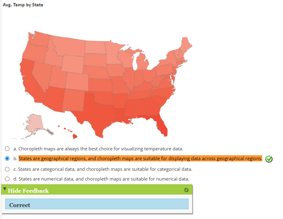 1. In the below Power BI example using sequential color, why is a choropleth map an appropriate choice for visualizing average annual temperature by state?
